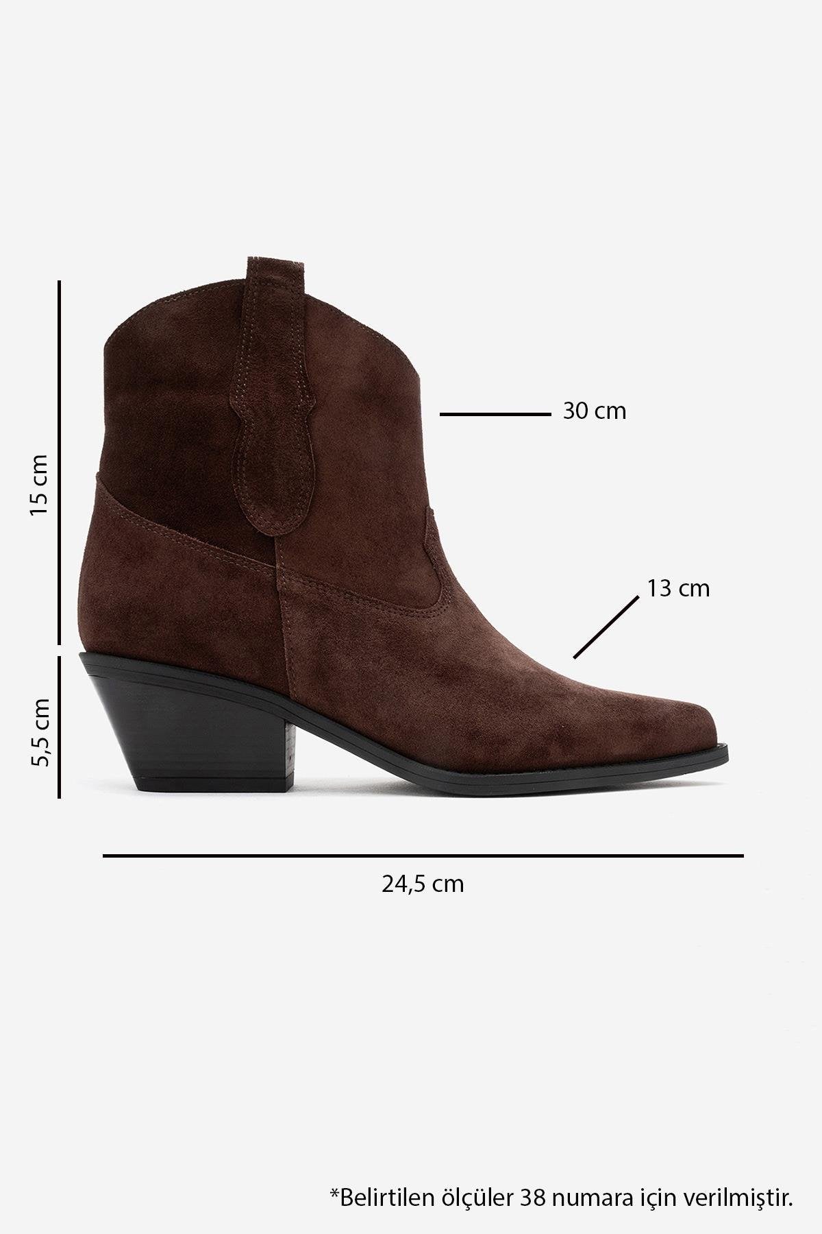 A refined western boot that blends soft suede texture with a timeless silhouette | 2.1" (5.5 cm) heel | 5.9" (15 cm) shaft | 11.7" (30 cm) ankle circumference | 5.1" (13 cm) forefoot width | Genuine suede leather upper / Genuine leather, warm lining / rubber sole | Handmade in Turkey, true to size