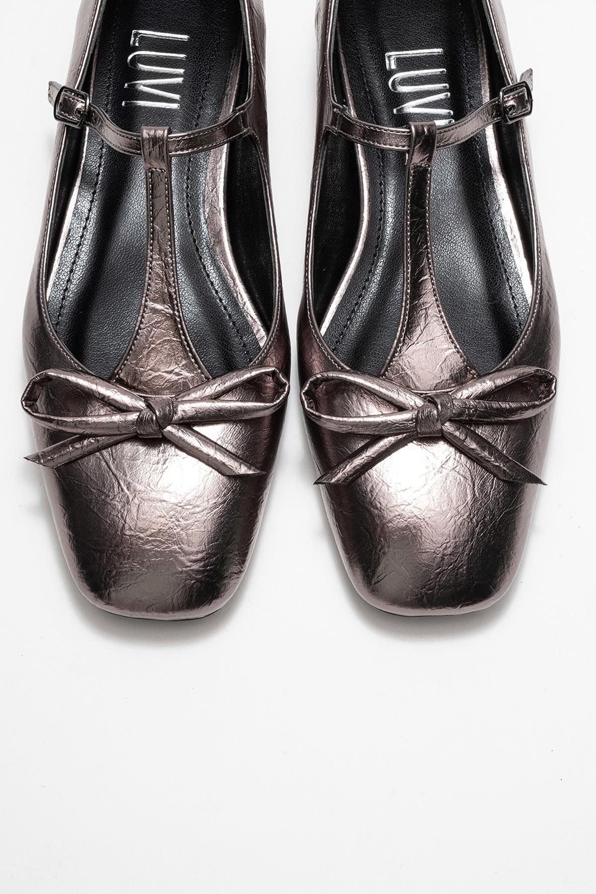 A modern, luminous ballet flat with a subtle bow and T-strap for refined femininity