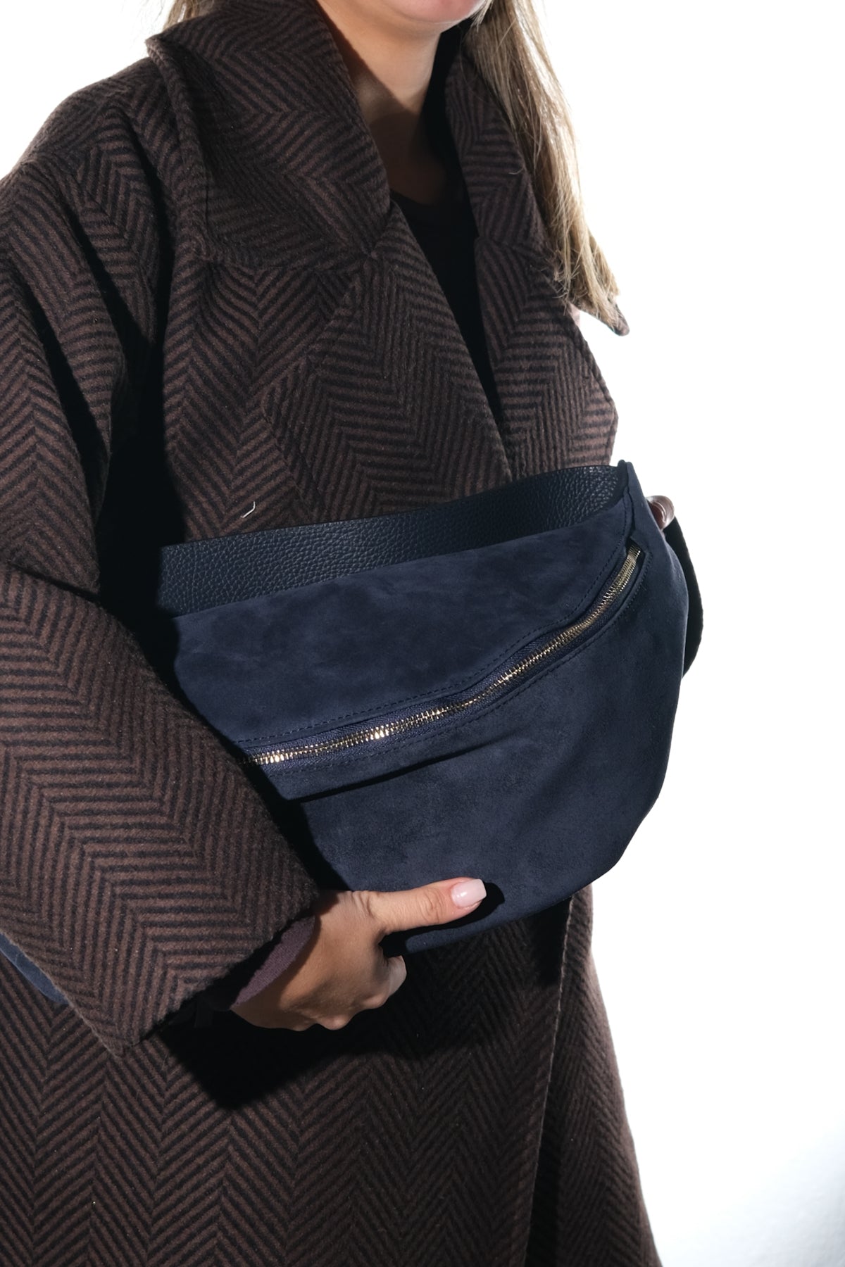 A modern body bag designed for everyday elegance and organized storage | 16.8" (43 cm) width | 8.6" (22 cm) height | 5.9" (15 cm) depth | Four zippered compartments | Zip closures | Genuine leather and genuine suede outer / Textile lining | Handmade in Turkey